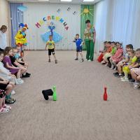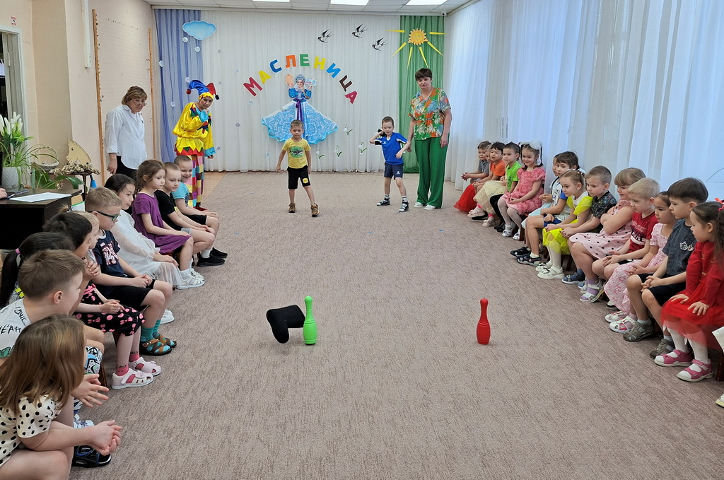 Ведущая рассказала, что в старину этот праздник знаменовал переход от зимы к весне. Поэтому ребята отгадывали загадки о зиме, чтобы не обидеть Зимушку. Весёлый Скоморох предложил детям разные забавы и развлечения. Началось веселье с частушек в исполнении дошкольников. Затем ребята с соревновательным задором приняли участие в «масленичных» забавах: сбивали кеглю валенком, передавали «блины» над головой, поиграли в подвижную игру «Весёлые блинчики», померялись силами в перетягивании каната. Песни «Как на тоненький ледок…» и «Песня – небылица» стали музыкальным украшением праздника.