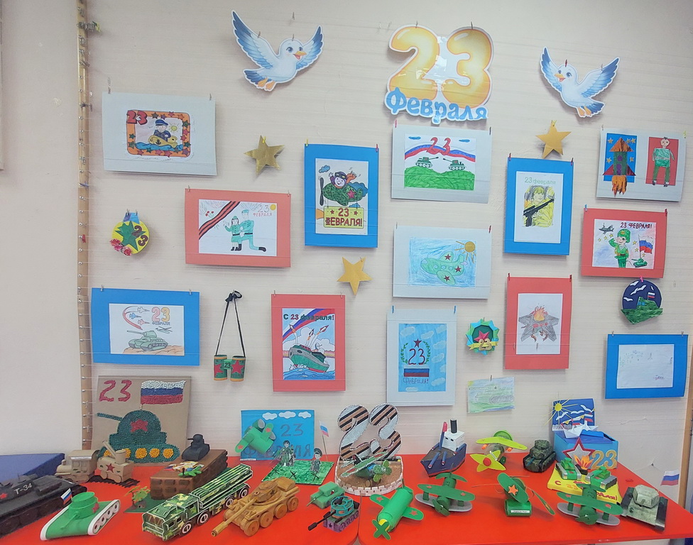 Вместе с родителями, воспитанники средней, старшей и подготовительной групп подготовили макеты военной техники и рисунки, которые были представлены на выставке рисунков и поделок «С 23 Февраля!».