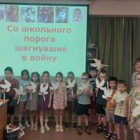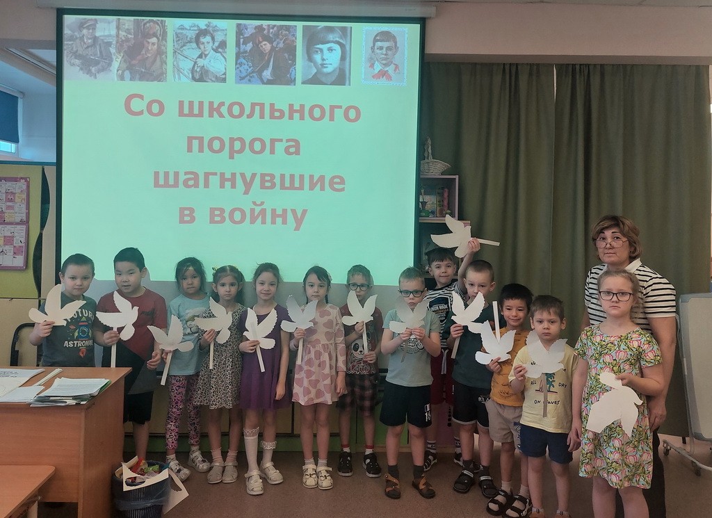 С рассказа о начале Великой Отечественной войны, о тяжёлом военном времени, о детях, их судьбах в годы войны, начала свой рассказ воспитатель Баирта Эрдниевна. Мальчики и девочки, попавшие на войну, быстро расстались с детством, вставая плечом к плечу со взрослыми в тылу и на фронте. Ребята с интересом просмотрели презентацию о детях – героях Великой Отечественной войны. Педагог рассказала о подвигах детей, показала памятники в честь юных героев, фотографии. Особенно потрясла ребят фотография расстрелянного фашистами Вити Черевичкина, который держал в руке почтового голубя, с помощью которого отправлял сообщения партизанам.