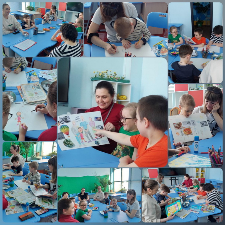 центре коллажа нарисовали свои семьи, а мамы добавили вырезки