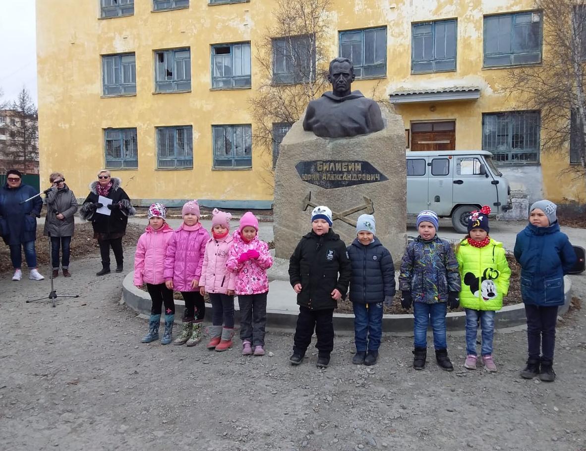 На торжественном мероприятии воспитанники ДОУ читали стихи в честь первооткрывателя Золотой Колымы, ученого – геолога Ю.А. Билибина и возложили цветы к его памятнику.