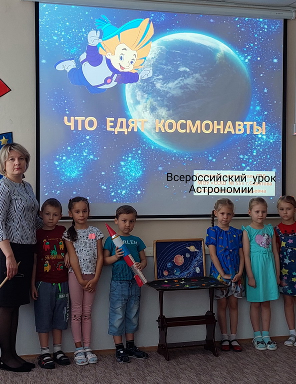 В рамках проведения Всероссийского урока астрономии 22 октября 2021 года в подготовительной группе детского сада «Алёнушка» было организованно и проведено познавательное мероприятие «Тайны звёздного неба». На этом уроке ребята узнали о Солнечной системе, планетах и звёздах, а также о наших великих космонавтах и учёных, которые исследуют космос. Воспитатель Бриненко Л.И. рассказала детям ещё и о том, как в условиях космоса живут и работают Российские космонавты. Ребятам очень понравились новые знания.