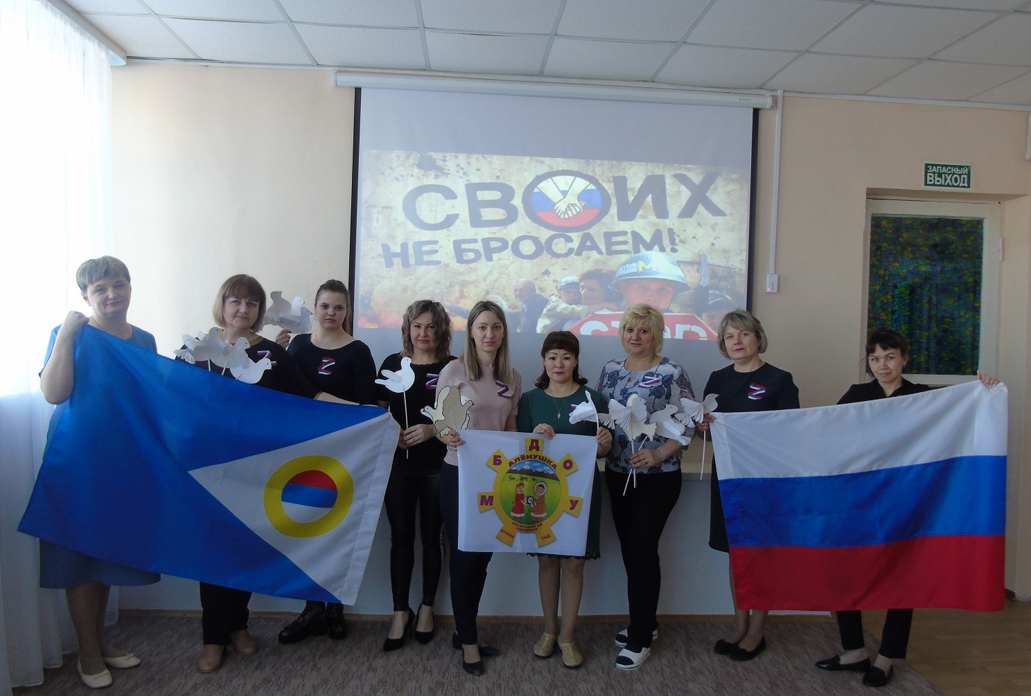 15 марта 2022 года сотрудники МБДОУ Детский сад «Аленушка» города Билибино приняли участие в Акции #СвоихНеБросаем с хештегом #ЗаПрезидента, заявляя о своей позиции «Zа» в поддержку операции России.