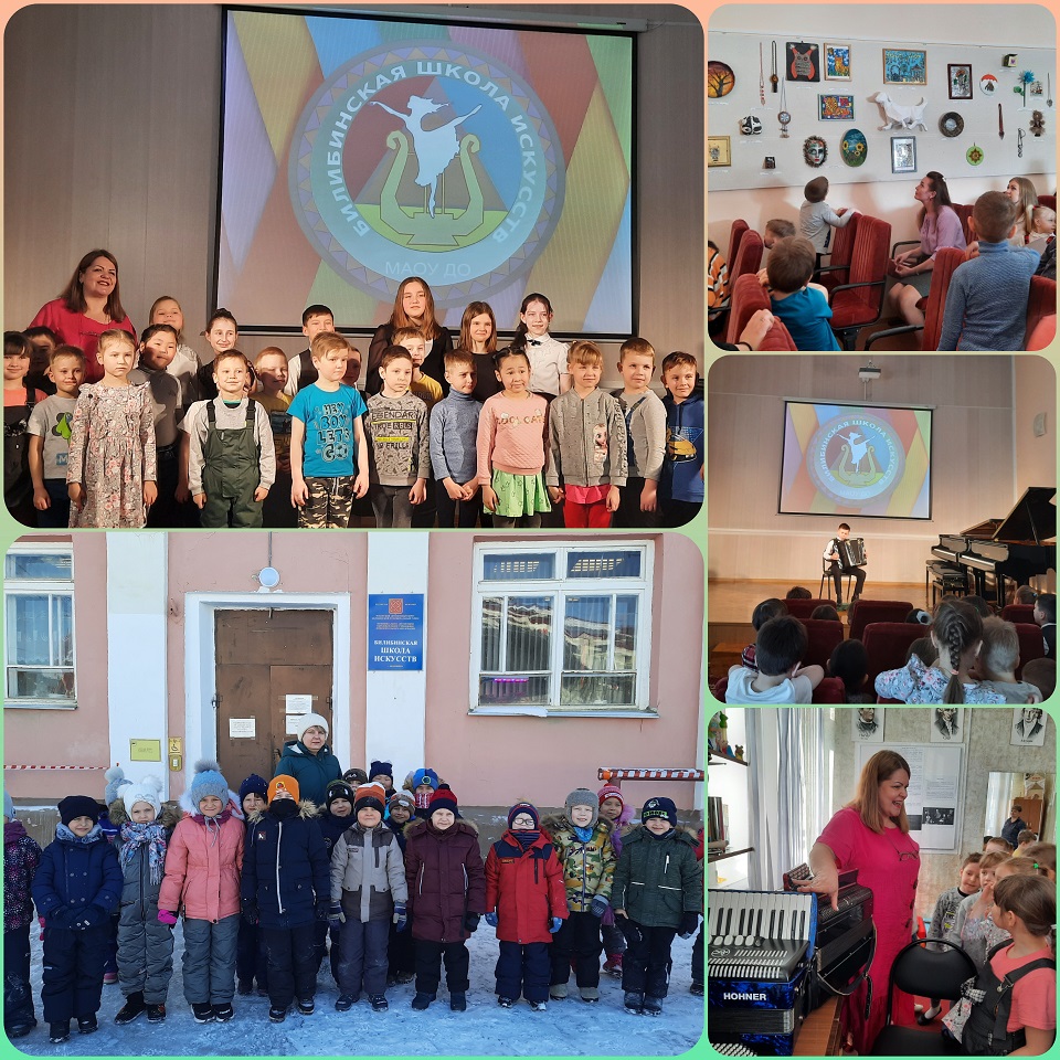 28 марта 2022 года воспитанники подготовительной к школе группы «Фиксики» МБДОУ Детский сад «Аленушка» были приглашены на обзорную экскурсию в Билибинскую школу искусств.