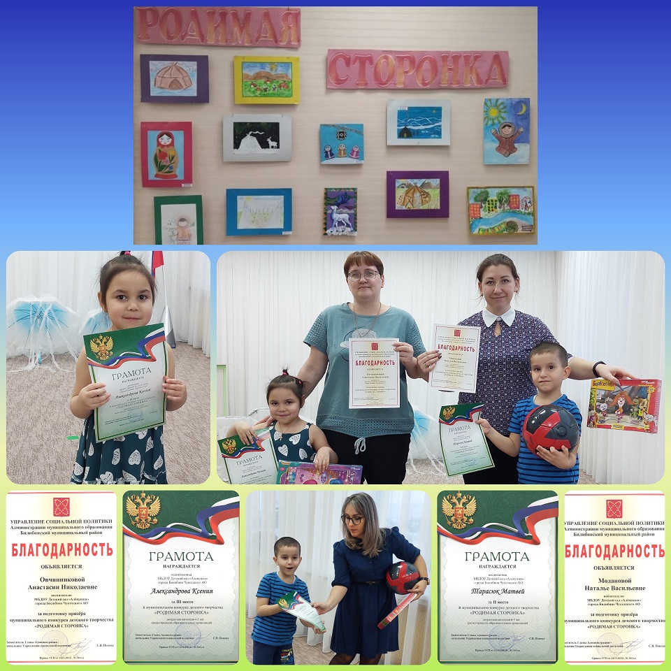 Призеры конкурса награждены Грамотами Управления социальной политики Администрации муниципального образования Билибинский муниципальный район и ценными подарками, их руководители награждены Благодарностями Управления социальной политики Администрации муниципального образования Билибинский муниципальный район за подготовку призеров муниципального конкурса детского творчества «Родимая сторонка».