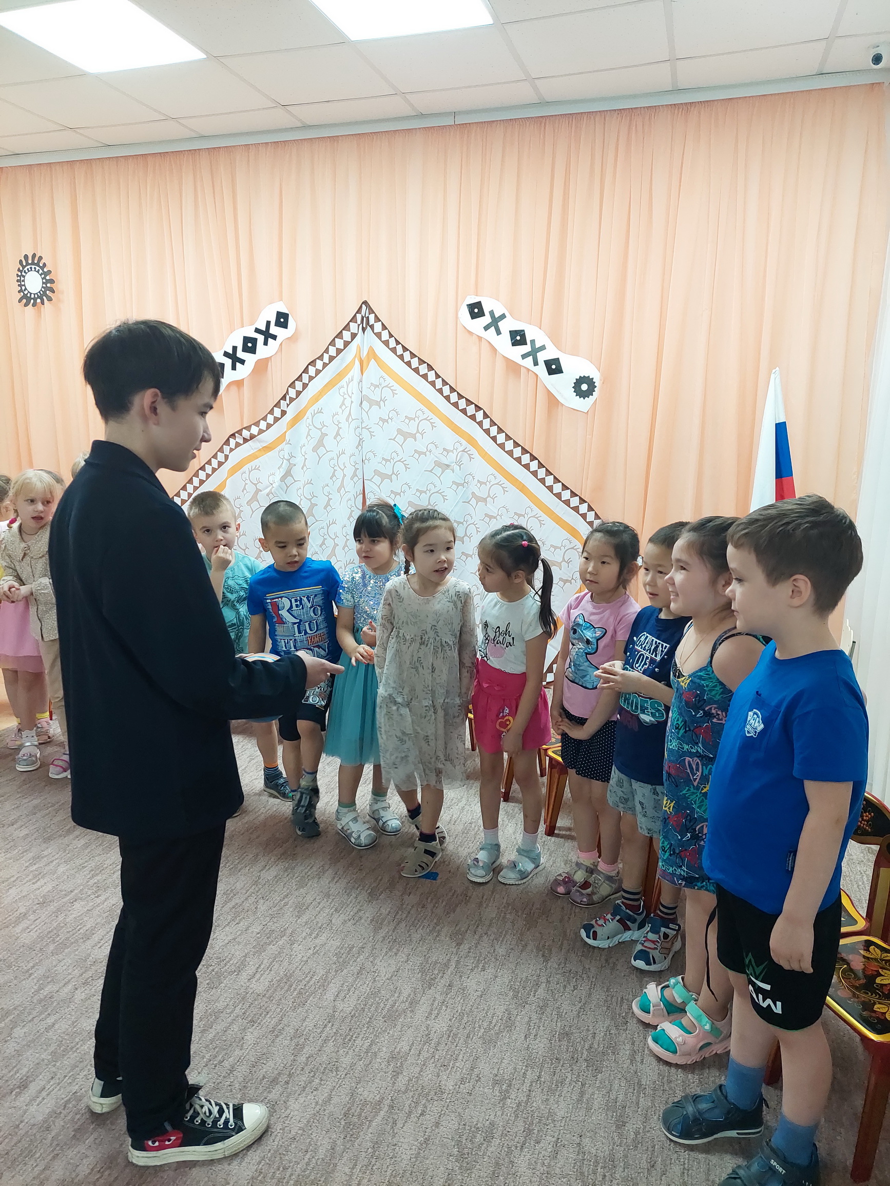 22 ноября 2023 года к ребятам подготовительной группы МБДОУ Детский сад «Аленушка» пришёл участник муниципальной научно – практической конференции «Родной язык – душа народа» Филипп Попов. Юноша показал детям эвенский календарь, перешедший ему в наследство от предков, и рассказал о порядке исчисления месяцев у эвенов. Ребята с увлечением слушали, что исчисление месяцев года у эвенов начинается с макушки, затем слева – направо по частям рук, повторяли за гостем движения и название месяцев по - эвенски.