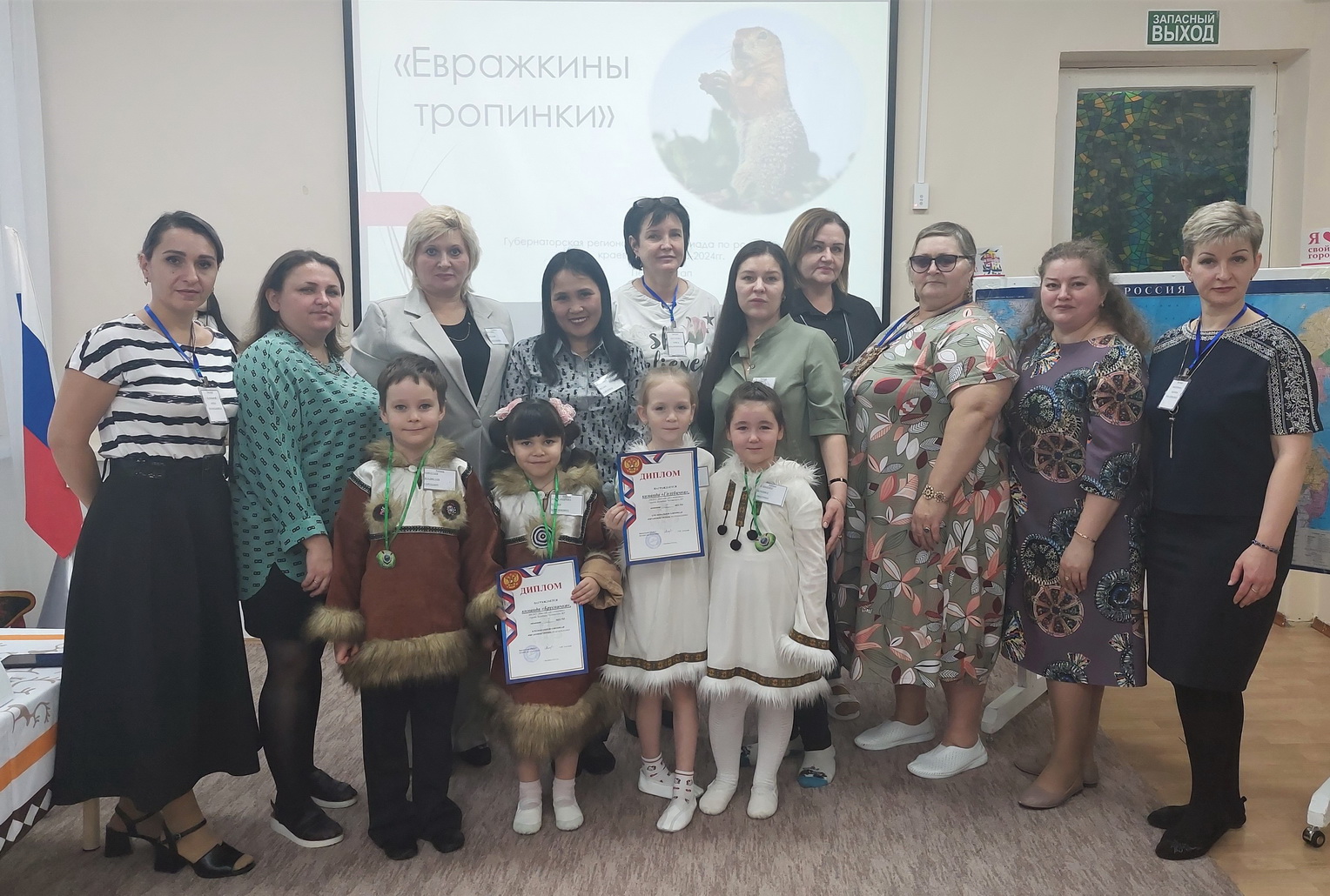 В детском саду «Алёнушка» 8 декабря был проведён 1 этап Региональной олимпиады «Евражкины тропки» по краеведению. В олимпиаде приняли участие 4 воспитанника подготовительных групп и 4 взрослых, которые дополняли ответы детей во время заданий. Дети были одеты в костюмы, стилизованные под одежду чукчей. Было создано 2 команды «Брусничка» и «Голубичка». Ведущий подготовила презентацию и приветственные слова участникам олимпиады, жюри и присутствующим, с которых и началось мероприятие.