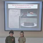 В рамках мероприятия прошла Акция «Блокадный хлеб». Воспитатель рассказала о ценности пищи и хлеба для жителей блокадного Ленинграда. Ребята рассказали стихи о ленинградском блокадном хлебе. Дети рассмотрели кусочек чёрного хлеба весом 125 граммов, побеседовали о том, как ценен хлеб и еда для людей.