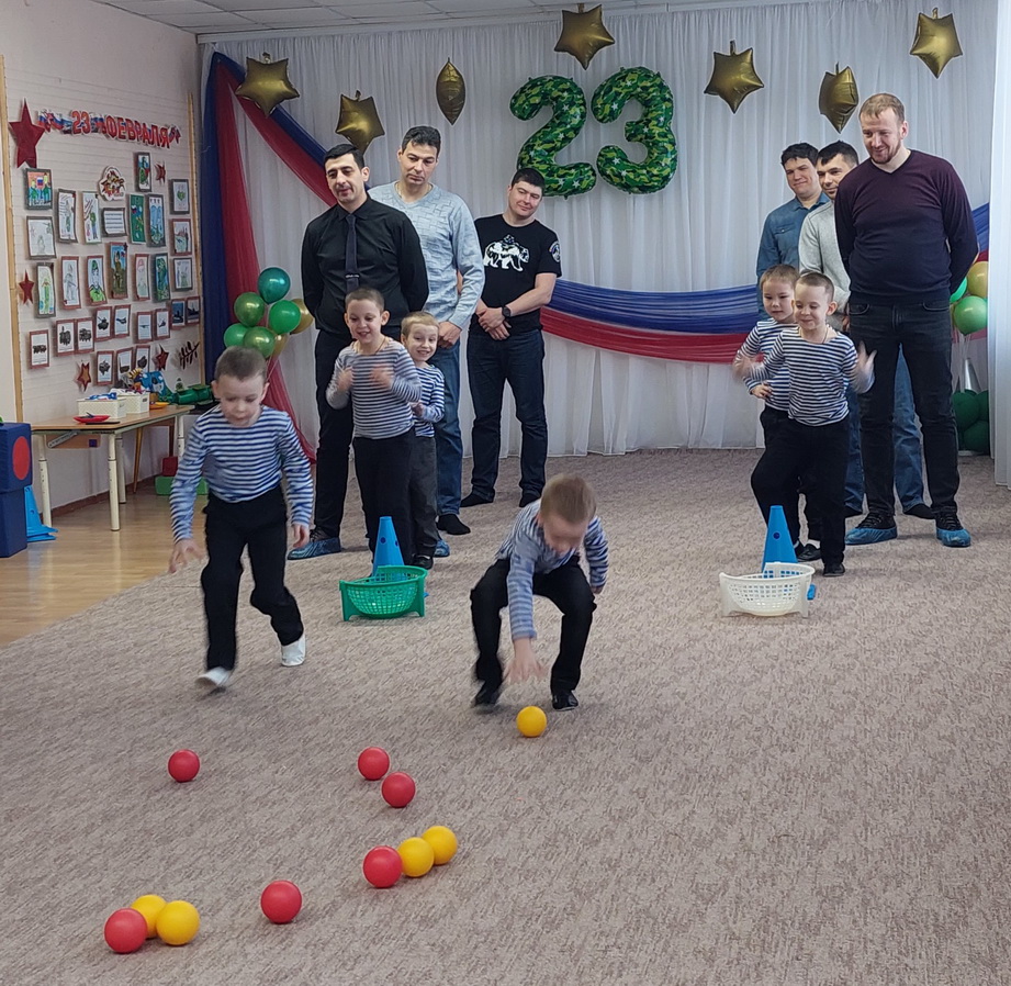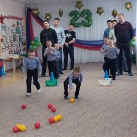 Самые старшие дошкольники побывали вместе с папами, братьями и дедушками в «Школе молодого бойца». После зажигательной разминки команды в смешанном составе дети – взрослые проходили задания – эстафеты: «Поварята», «Боевая тревога», «Связисты», «Кавалеристы». Девочки исполнили песню «Я папина дочка», а в конце утренника ребята вручили папам подарки.