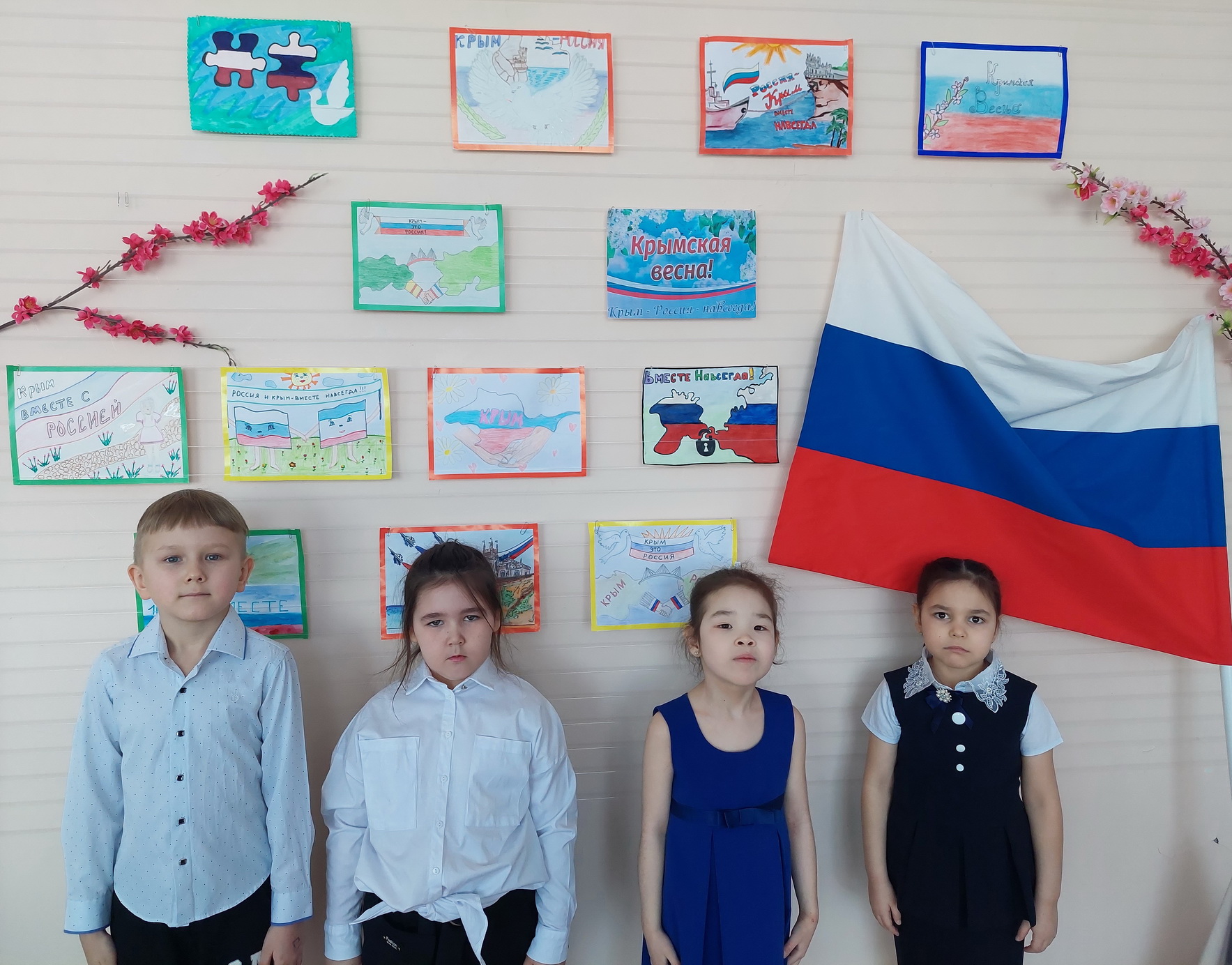 Воспитанники старшей и подготовительной групп подготовили рисунки на выставку «Крымская весна». Воспитанники подготовительной группы просмотрели презентацию о символах России и республики Крым, рассказали стихи и исполнили Гимн Российской Федерации и озвучили свои пожелания для России и Крыма: «быть богатыми», «всегда побеждать врагов», «дружить и помогать друг другу», «быть сильными и непобедимыми».