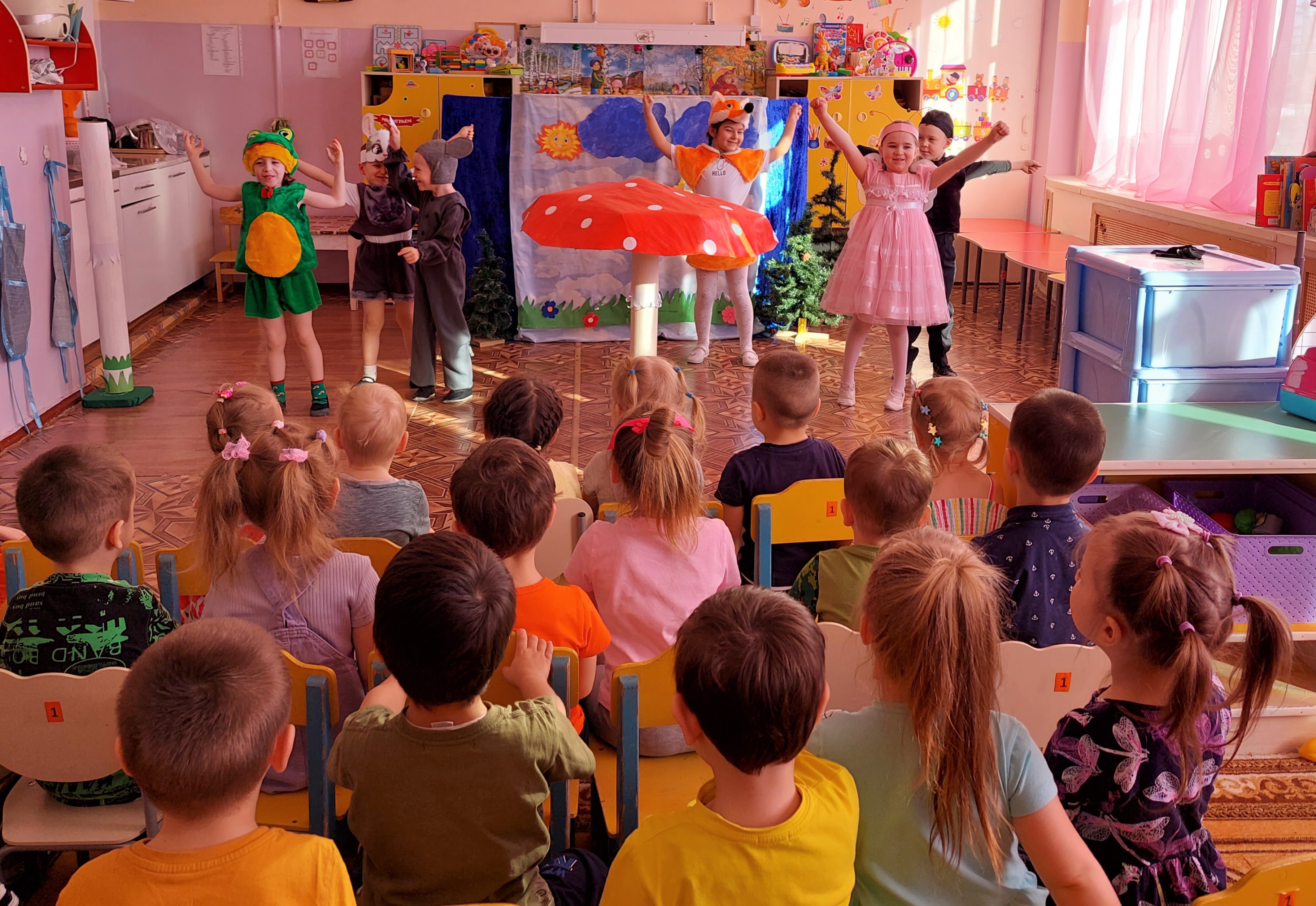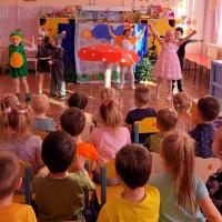 5 апреля под руководством учителя - логопеда ребята из старшей группы выступали перед малышами с театрализацией сказки Владимира Сутеева «Под грибом». Тщательно подготовленные декорации и костюмы артистов, игра актёров не оставила равнодушным ни одного зрителя. В конце года очень много внимания логопед уделяет автоматизации звуков в речи детей, развитию интонационной выразительности речи. Участие в театрализованном представлении прекрасная возможность решить эти задачи, а ещё помочь застенчивым детям преодолеть барьер выступления на публике, воплотить в актёрской игре свои творческие способности. Представление удалось на славу и понравилось как зрителям, так и самим актёрам.