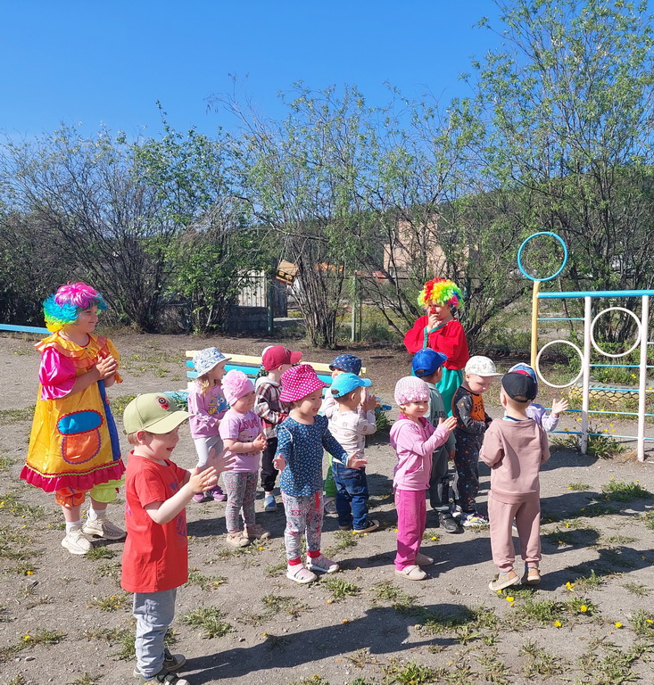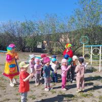 19 июня, в канун Дня астрономического лета воспитанники из второй группы раннего возраста детского сада «Алёнушка» вышли на прогулку. В ясный и солнечный летний день на участке детского сада звучала музыка. Малыши под слова «вот оно какое, наше лето…» познакомились с гостями: клоунами «Клёпой» и «Кнопочкой». Дети рассказали гостям, что они знают о лете. Клоуны показали упражнения «весёлой» зарядки, которые помогут детям быть бодрыми и здоровыми. Яркий зонтик стал атрибутом подвижной игры «Солнышко и дождик», а обруч и гимнастические палки помогли собрать Солнышко. Какое же лето без цветов и насекомых?! И к малышам прилетели бабочки, которым они помогли сесть на цветы соответствующей окраски. Одно из взрослых увлечений – рыбалка, знакомо и малышам. Они с помощью Клёпы и Кнопочки внимательно и сосредоточенно «ловили» рыбу в игрушечном водоёме. Игра с мыльными пузырями в конце мероприятия очень понравилась маленьким дошколятам. А подарки от Клёпы и Кнопочки – цветные мелки, вызвали бурю восторга, дети долго с увлечением рисовали на асфальте.