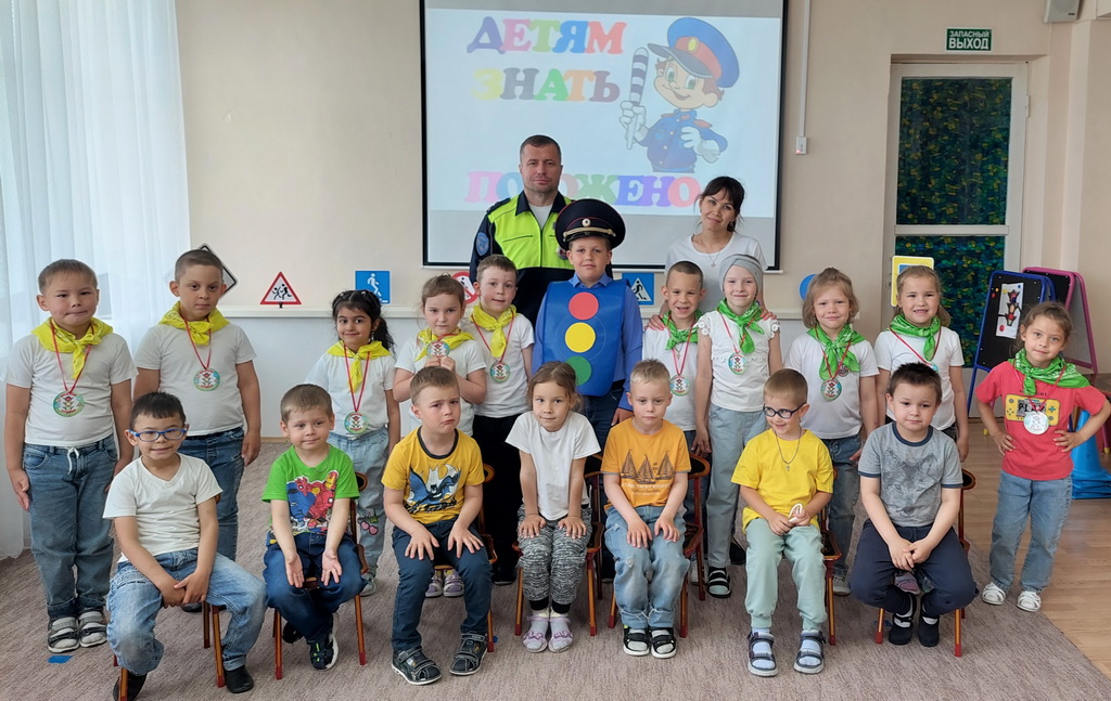 В начале мероприятия к детям пришёл Светофор Светофорыч Мигалкин и предложил ребятам проверить свои знания по правилам дорожного движения, соревнуясь в игре – викторине «Знатоки правил дорожного движения». Часть участников разделилась на две команды: «Водители» и «Пешеходы», а остальные стали болельщиками. В первом конкурсе Дмитрий Владимирович загадывал детям загадки о дорожных знаках, а команды показывали и называли отгадку. Следующий конкурс «Ловкий водитель»: участники команд вели машинки между кеглями «змейкой». Конкурс «Собери пазл», оказался не из лёгких, дети сначала отгадали, что нужно сложить светофор, затем сложили его на столе, а потом повторили на магнитных досках. В эстафете «Автобус» приняли участие и болельщики, «водители» на скорость с помощью обруча перевозили пассажиров в указанную точку. В конкурсе «Вопросы на засыпку», инспектор ГАИ задавал командам вопросы о передвижении пешеходов. В игре «Автомультики» с болельщиками, дети вспоминали средства передвижения «мультяшных» героев. В конце мероприятия дошкольники стихами поздравили Дмитрия Владимировича с праздником, а он вручил им медали «Знатоков правил дорожного движения».