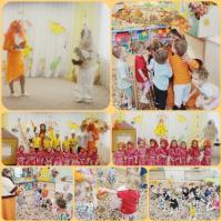 В этот день к малышам в гости пришли Королева Осень, косолапый Мишка и Зайчик. Для гостей ребята пели веселые песенки, читали стихи, играли в игры. Мальчики – грибочки и девочки – рябинки помогли Осени и Зайчишке собрать осенние листочки и станцевали с ними осенний танец.