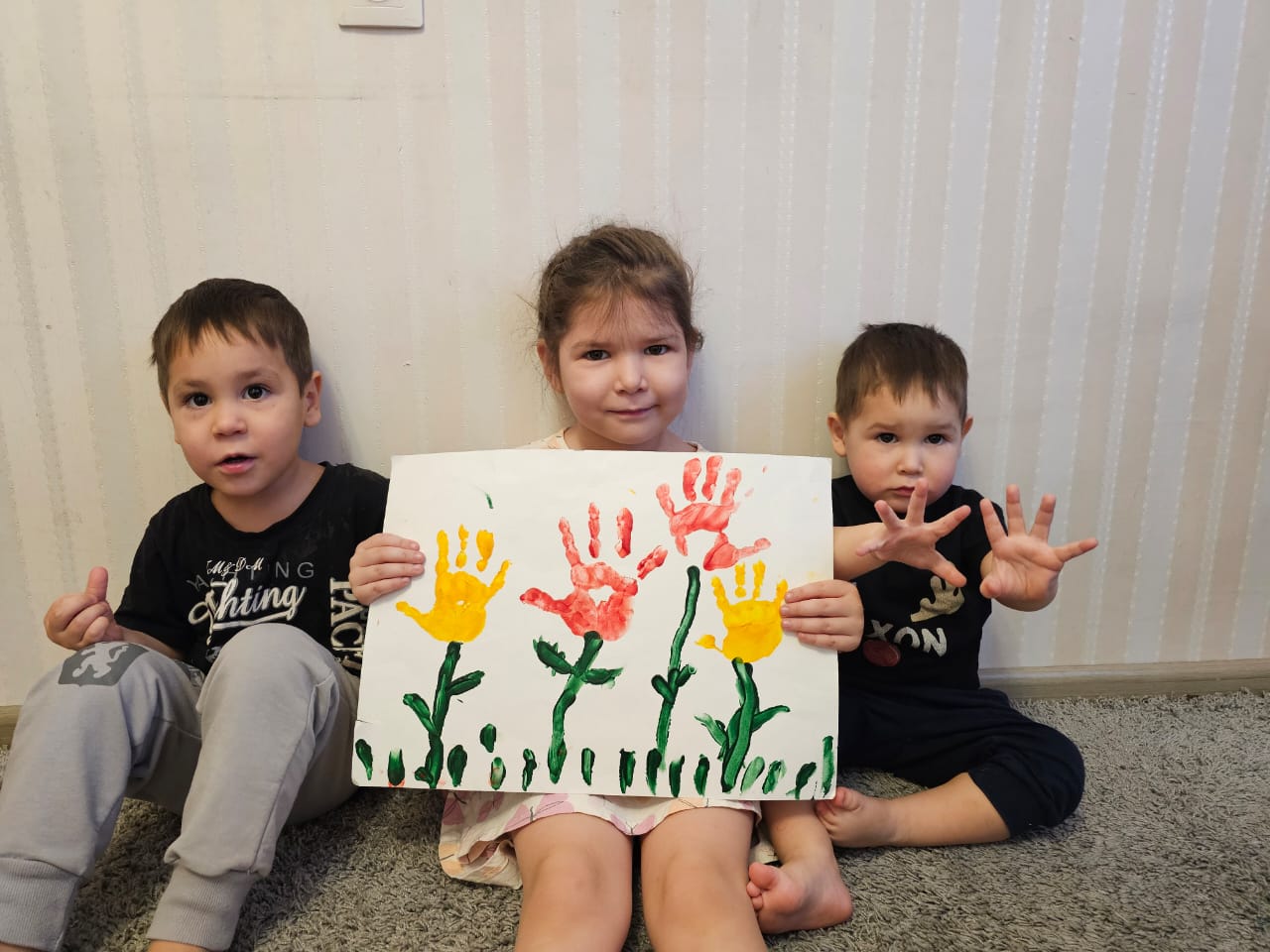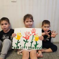 В структурном подразделении МБДОУ Детский сад «Алёнушка» – семейной дошкольной группе ко Дню матери ребята приготовили подарок для своей мамы и воспитателя. Уже с раннего возраста Юлия Ивановна учит детей рисованию пальчиковыми красками, дифференцированно подходя к решаемым задачам в разновозрастной группе. Малыши работают всей ладонью, а старшие дошкольники, прорисовывают уже мелкие детали пальчиком. Именно в технике пальчикового рисования дети создали букет для своей любимой мамочки – воспитателя, поздравив её с праздником.