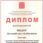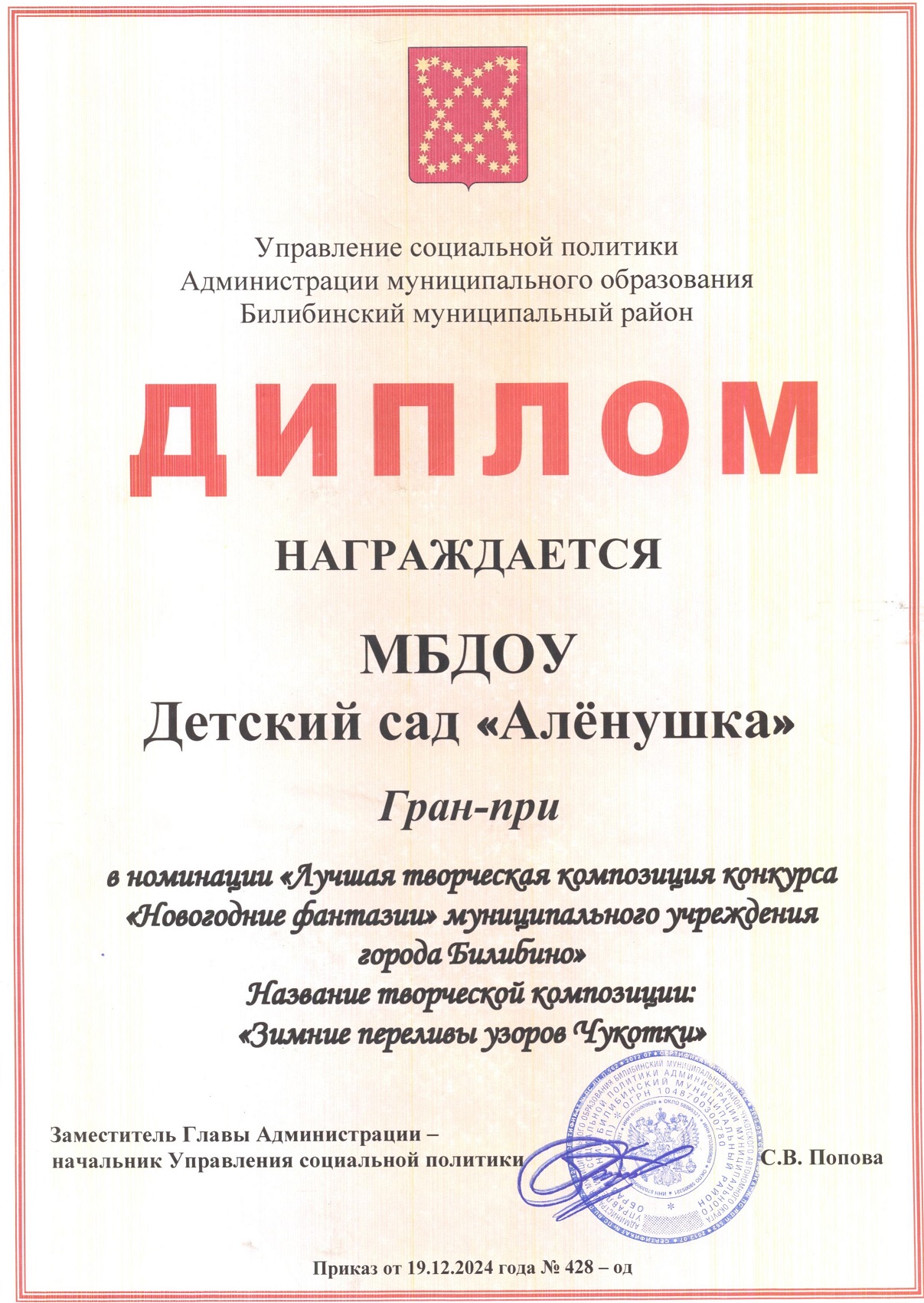 По итогам Конкурса МБДОУ Детский сад «Аленушка» награжден Дипломом Гран-при в номинации «Лучшая творческая композиция конкурса «Новогодние фантазии» муниципального учреждения города Билибино» и денежным вознаграждением в размере 35 000 рублей.