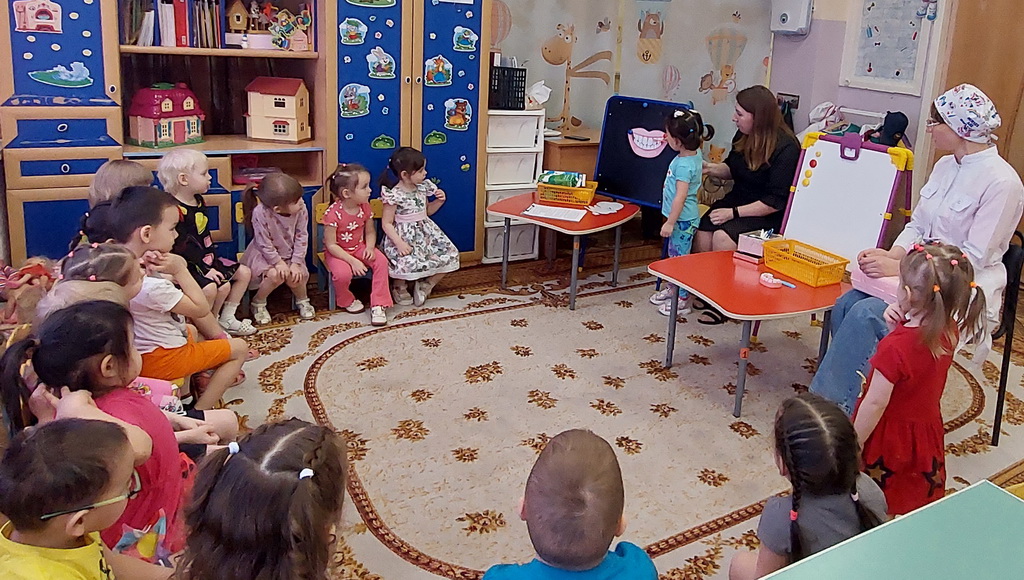 Воспитатель и медсестра рассказали, что, если не заботиться о зубах и есть много вредной пищи, то они могут заболеть кариесом.