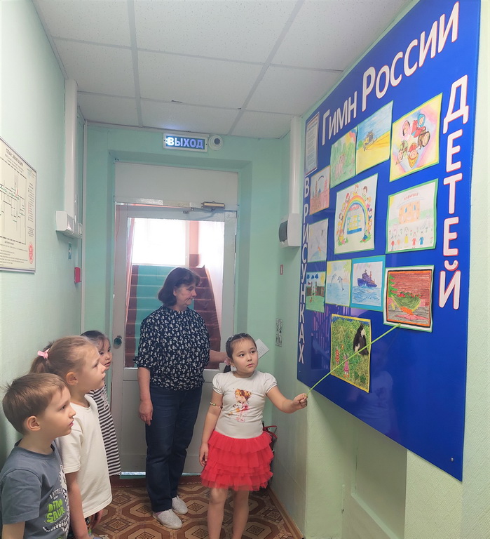 В детском саду «Алёнушка» учитель – логопед Мухамадеева Фарида Рустамовна реализовала патриотический проект «Гимн в рисунках ребёнка». Как выучить с дошкольниками Гимн России, так, чтобы они прочувствовали, пропустили через себя его смысл? Как объяснить ребятам значение его слов? Такие вопросы поставила перед собой педагог перед реализацией проекта. Прочитав детям Гимн и разобрав значение слов по куплетам, Фарида Рустамовна предложила детям отобразить в рисунках наиболее запомнившиеся им части текста. Это сложное задание ребята выполняли дома вместе с родителями. Когда рисунки были готовы, оформили стенд в детском саду. Во время представления результатов проекта дети прочли строки из Гимна и показали товарищам свои рисунки, рассказав, что именно там изображено. Такое глубокое осознание смысла одного из главных символов страны способствует воспитанию гордости за нашу Родину уже в дошкольном возрате.