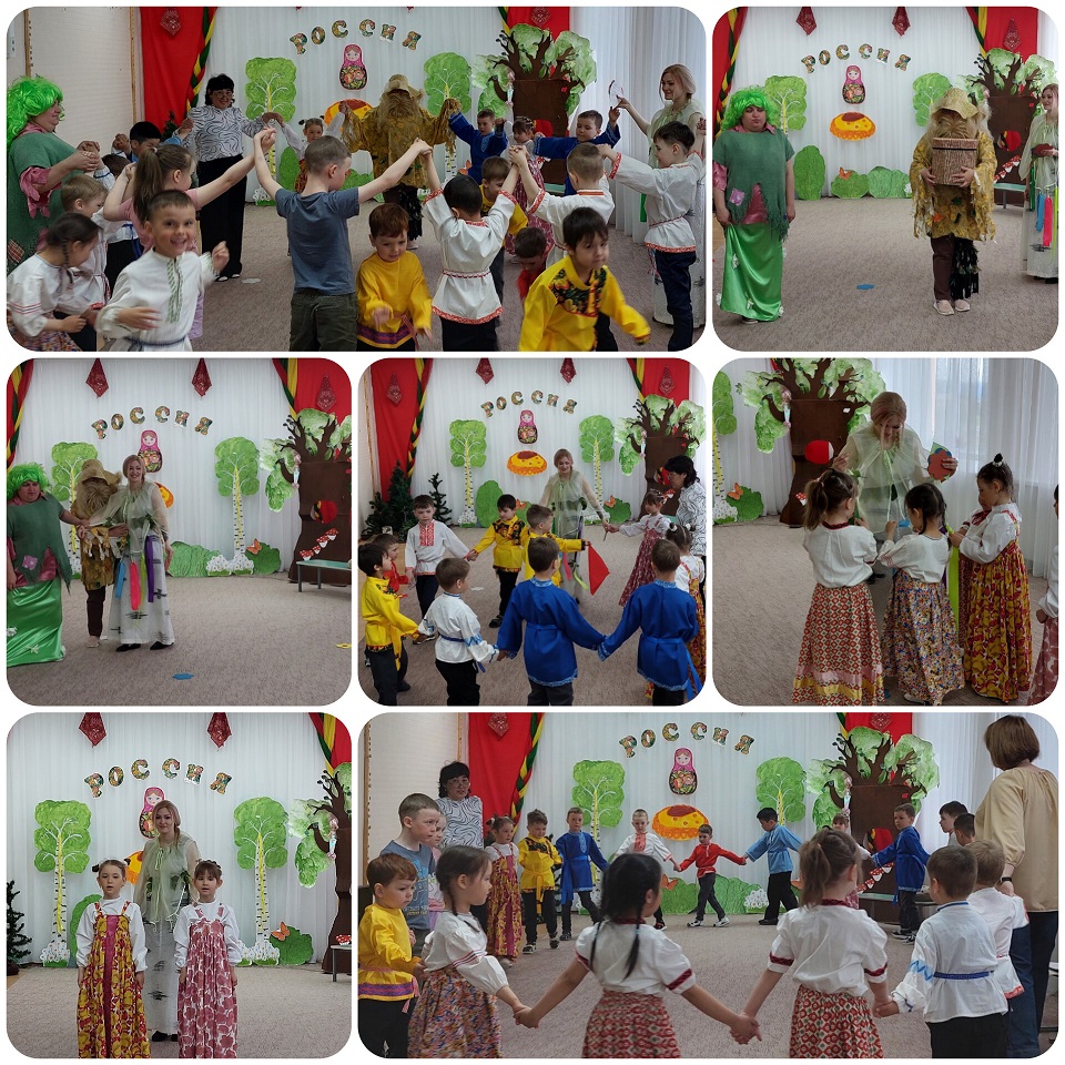 Чтобы познакомить ребят с традициями «Троицы», к ним в гости пришла русская красавица – Березка, с играми, песнями и хороводами. Лешему и Кикиморе не удалось украсть березку и испортить шумный и веселый праздник. Ребята читали Березке стихи, украшали лесную красавицу яркими лентами, а девочки исполнили песню «Красавицы березки».