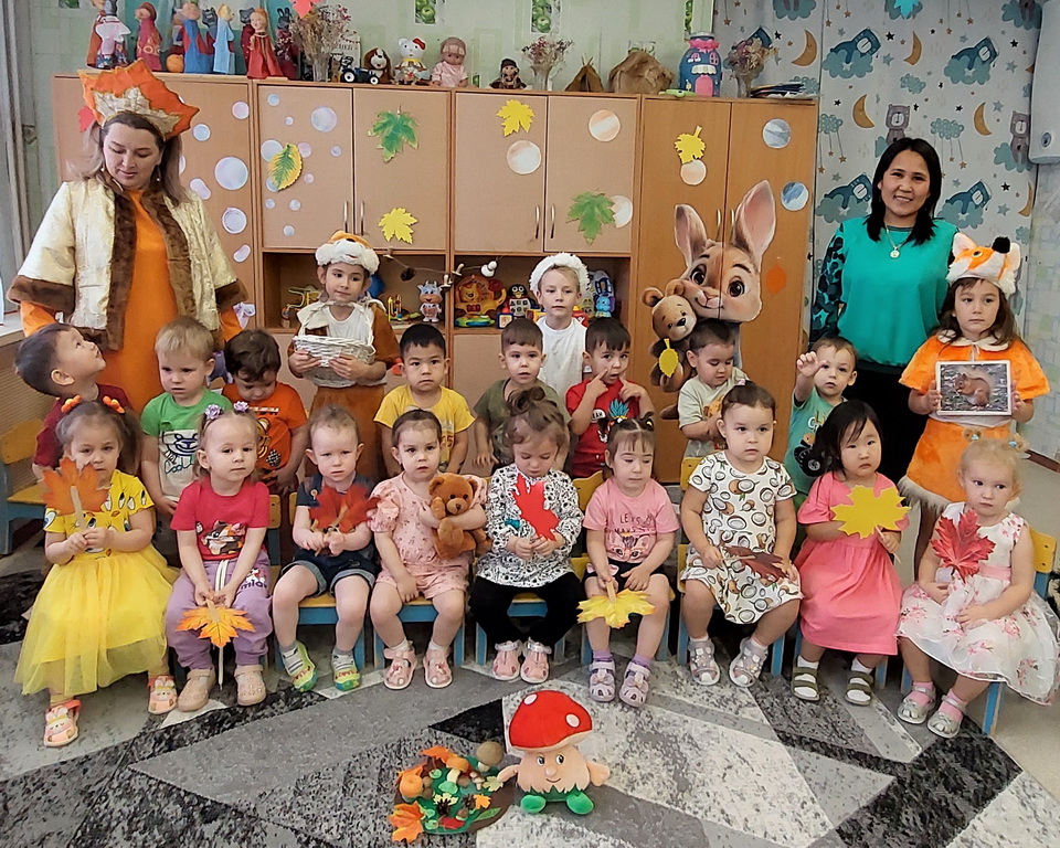 19 сентября самые маленькие воспитанники детского сада «Алёнушка» с восторгом и удивлением встречали гостей. В этот день к малышам пришла в гости Осень. Свои подарки – яркие осенние листья Осень раздала детям и пригласила их на танец с листиками. Какая же осень без листопада?! Ребята устроили «Листопад», правда не только листья опускались на пол, но и некоторые дети захотели стать листочками. Вместе с Осенью пришли лесные звери, артисты из подготовительной группы. Все они пришли с подарками – играми. Зайчик предложил игру «Зайка умывается», Лисичка показывала детям картинки с изображением диких зверей, а ребята угадывали. Белочке малыши помогли собрать шишки, рассыпавшиеся из корзинки. С медвежонком повторили любимую игру «У медведя во бору».