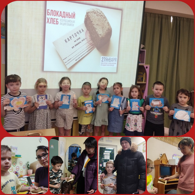 Воспитатель Никодинова Баирта Эрдниевна провела с воспитанниками беседу о тяжёлых днях блокадного Ленинграда, о Дороге жизни, о том, как жили и выживали люди в это страшное время. Особое внимание было уделено рассказу о блокадном хлебе, небольшой кусочек которого жители блокадного Ленинграда делили на 30 частей, по количеству дней в месяце – минимальную норму выдачи хлеба в блокадном Ленинграде. С большим вниманием дети просмотрели видеофильм о блокадном Ленинграде. В заключении тематической беседы, дети изготовили аппликацию «Блокадный хлеб».